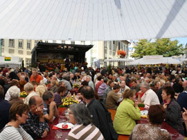 Acht Gastronomen werden sich in ihren einheitlichen weißen und liebevoll dekorierten Verkaufszelten wieder kreisförmig auf dem Göppinger Marktplatz anordnen. Ein besonderes Ambiente bietet dabei ein weißer Schirm von 30 Meter Durchmesser, der in luftiger Höhe eventuelle Regenschauer abhält und den Besuchern dadurch trockene Füße garantiert.