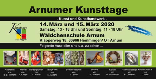 Seit mehr als 42 Jahren finden die „Arnumer Kunsttage“ bereits statt. Zahlreiche langjährige und neue Künstlerinnen und Künstler zeigen am 31. Oktober und 1. November ihre Arbeiten in der schönen Wäldchenschule in Arnum bei Hemmingen. Dieser kleine aber feine Markt überrascht die Besucher immer wieder mit kunsthandwerklichen Produkten, die den Alltag vergessen lassen. Die Besucher werden dabei wieder auf eine interessante und abwechslungsreiche Entdeckungsreise eingeladen, nicht nur um Endprodukte zu begutachten sondern auch um ihre Entstehung bei vorführenden Künstlern zu beobachten. Ob elegant oder extravagant, schlicht oder aufwendig, modern oder klassisch, kleine Schätze für jegliche Geschmacksrichtungen dürften dort wieder zu finden sein.