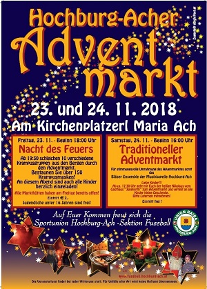 Der Adventmarkt der Sportunion Hochburg-Ach beginnt traditionell am Freitag vor dem Ewigkeitssonntag, dem 21. November 2025, um 17:00 Uhr mit der Nacht des Feuers am Kirchplatzerl Maria Ach. Alle Markthütten sind am Freitag bereits geöffnet. Gegen 19:30 Uhr schleichen zehn verschiedene Krampusgruppen aus den Bergen durch den Adventmarkt. Eintritt 2,- €, Jugendliche unter 16 Jahren frei.