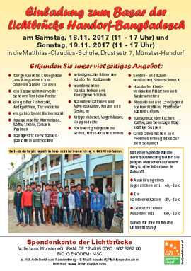 Der Weihnachtsbasar der Lichtbrücke Handorf-Bangladesh öffnet traditionell am Wochenende vor dem Ewigkeitssonntag, dem und , samstags und sonntags von 11:00 bis 17:00 Uhr in der Matthias-Claudius-Schule in Münster-Handorf.