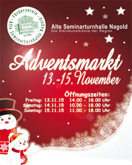 Der Nagolder Adventsmarkt öffnet am dritten Novemberwochenende, vom bis , freitags bis sonntags in der Alten Seminarturnhalle in Nagold.