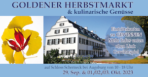 Der Goldene Herbstmarkt öffnet am ersten Oktoberwochennde, vom 03. bis 05. Oktober 2025, freitags bis sonntags von 10:00 bis 18:00 Uhr auf Schloss Scherneck in Rehling.