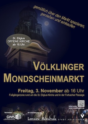 Die Gesellschaft für Wirtschaftsförderung, Innovation und Stadtmarketing (GWIS) mbH veranstaltet mit Unterstützung der Agentur Lorraine Médiévale am Freitag, dem , von 16:00 bis 23:00 Uhr wieder den Völklinger Mondscheinmarkt in der Innenstadt rund um die Kirche St. Eligius.