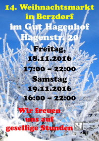 Der Weihnachtsmarkt der Dorfgemeinschaft Berzdorf öffnet traditionell am Wochenende vor dem ersten Advent, dem und , freitags von 17:00 bis 22:00 Uhr und samstags von 16:00 bis 22:00 Uhr im Gut Hagenhof in Wesseling-Berzdorf.