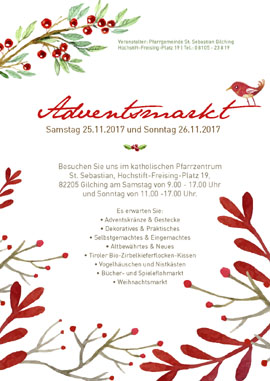 Der Gilchinger Adventsmarkt öffnet traditionell am Wochenende vor dem ersten Advent, dem und , samstags von 09:00 bis 17:00 Uhr und sonntags von 11:00 bis 17:00 Uhr im und am Pfarrzentrum der katholischen Pfarrgemeinde St. Sebastian in Gilching.