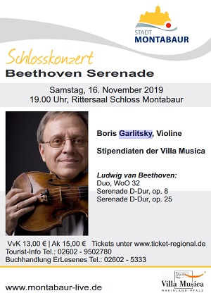 Das Schlosskonzert der Stipendiaten der Villa Musica – Beethoven Serenade – beginnt am Samstag, dem 16. November 2019, um 19:00 Uhr im Rittersaal Schloss Montabaur.