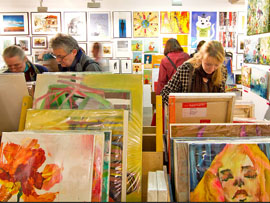 Wir bieten eine breite Palette an Werken, die alle preiswert sind, denn, so ein weiteres Prinzip, Kunst soll erschwinglich sein für jedermann. „Kaufbar“ durch niedrige Preise, aber auch durch die exponierte Lage unserer Geschäftsräume inmitten von Einkaufsmeilen. Wir sind damit gut erreichbar für ein großes, heterogenes Publikum, das an diesen Orten des täglichen Bedarfs verkehrt und dann oftmals eher zufällig auf den Kunstsupermarkt stößt. Der Kunstsupermarkt stellt sich ihm quasi in den Weg.