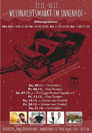 Der Wintergarten im Innenhof „Zum güldenen Rade“ öffnet vom bis montags bis donnerstags von 16:00 bis 22:00 Uhr, freitags und samstags von 12:00 bis 23:00 Uhr, und sonntags von 12:00 bis 16:00 Uhr in Erfurt.